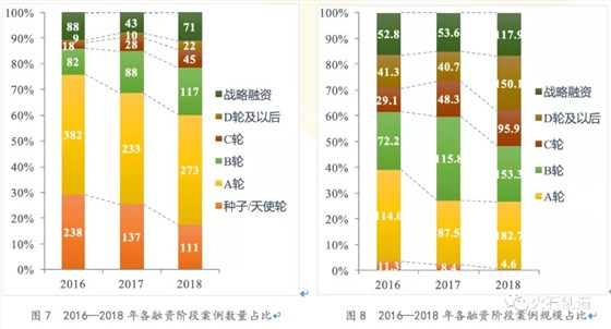 從融資階段看,投資更趨向后期階段集中。2018年,B輪及以后融資項目數(shù)量共255起,占全年融資項目比重的39.9%,比2017年上升了10%,比2016年上升15.9%,投資趨勢與前兩年相比,更往后期階段集中。早期融資項目數(shù)量明顯較少,表明資本對于醫(yī)療健康產(chǎn)業(yè)前期的創(chuàng)新投資越加謹慎。